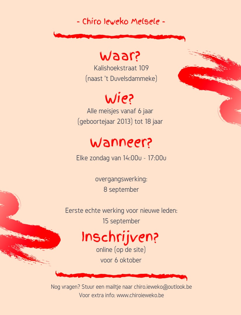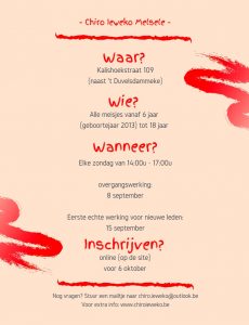 De eerste werking is op 8 september, dit is de overgangswerking en is enkel bedoeld voor de leden die al in de Chiro zitten.